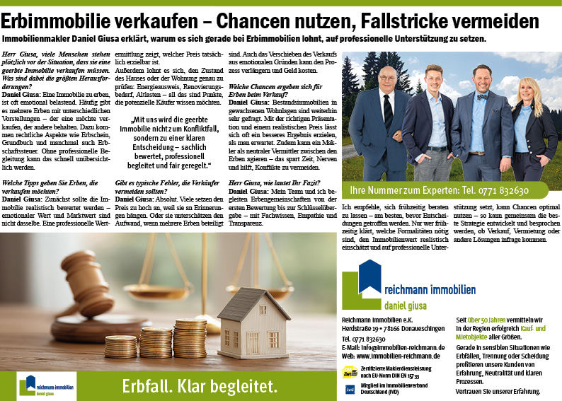 Daniel Giusa: Bestandsimmobilien in gewachsenen Wohnlagen sind weiterhin sehr gefragt. Mit der richtigen Präsentation und einem realistischen Preis lässt sich oft ein besseres Ergebnis erzielen, als man erwartet. Zudem kann ein Makler als neutraler Vermittler zwischen den Erben agieren – das spart Zeit, Nerven und hilft, Konflikte zu vermeiden.
